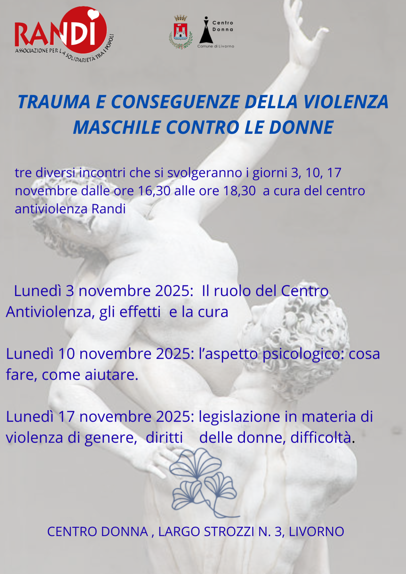 Lunedì 3 novembre, ore 16.30 / lunedì 10 novembre ore 16.30 / lunedì 17 novembre ore 16.30, sempre presso il Centro Donna - Ciclo di incontri "Trauma e conseguenze della violenza maschile contro le donne"