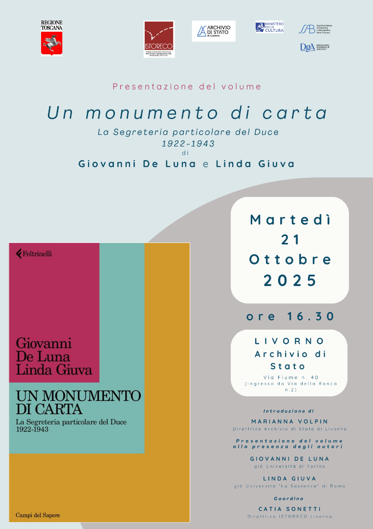 Martedì 21 ottobre nella sala dell’Archivio di Stato di Livorno (ingresso da via della Banca, 2) si terrà la presentazione del volume di Giovanni De Luna e Linda Giuva Un monumento di carta. La Segreteria particolare del Duce 1922-1943, ed. Feltrinelli, Milano 2024.