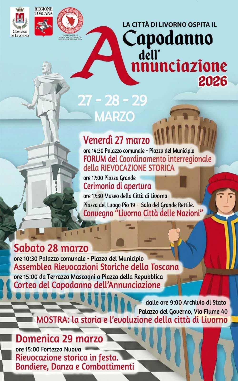 Livorno, 26 marzo 2026 - Armigeri, cavalieri, dame, arcieri, sbandieratori e musici animeranno Livorno nel fine settimana, a partire da domani venerdì 27 marzo fino a domenica 28. La nostra città ospiterà le celebrazioni del Capodanno dell'Annunciazione, ricorrenza che rievoca l’antico calendario in uso in Toscana fino al 1749, quando l’anno civile iniziava il 25 marzo, in coincidenza con la festa religiosa dell’Annunciazione.