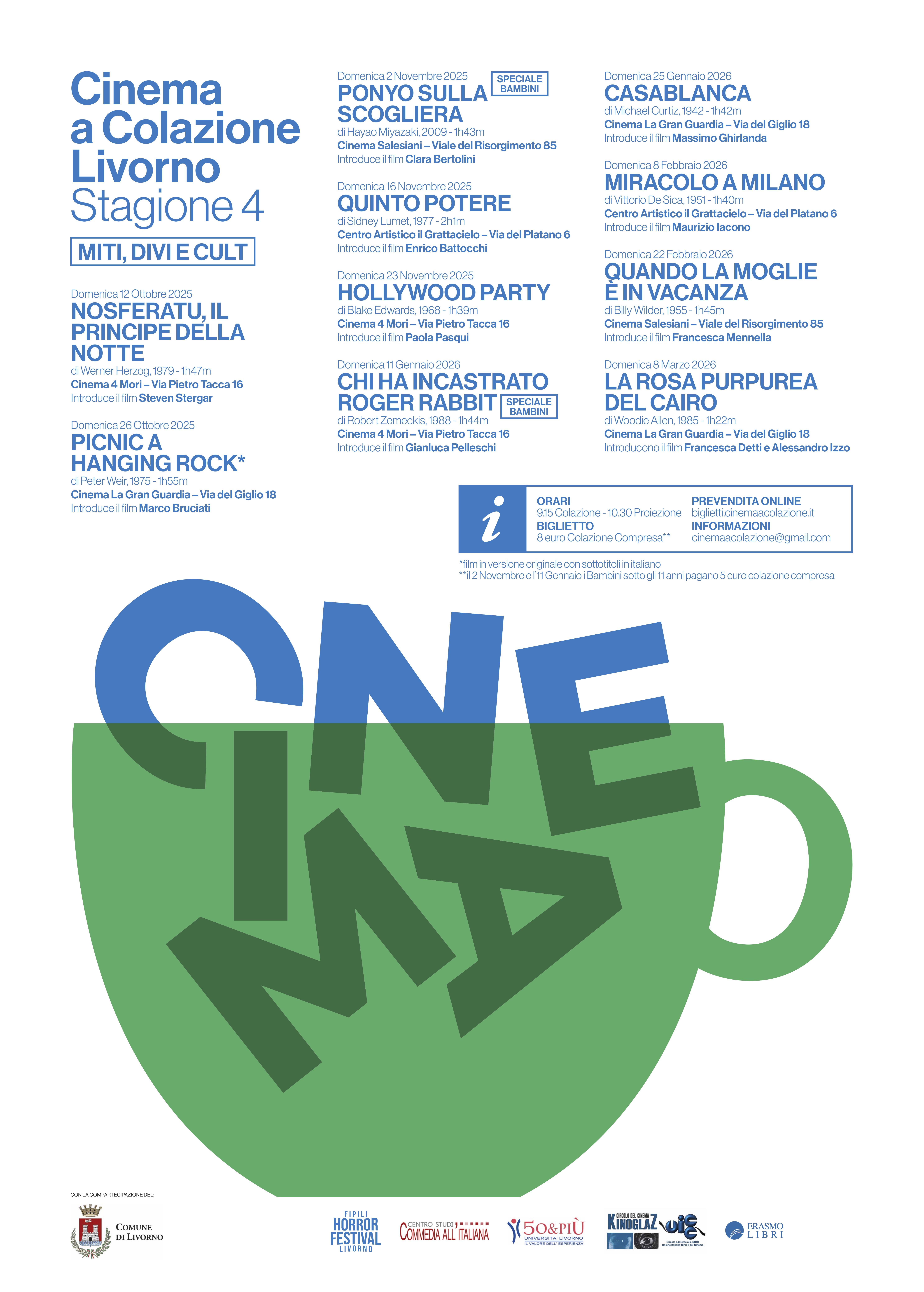 Dopo il successo delle tre precedenti edizioni torna CINEMA A COLAZIONE. Giunta alla sua quarta Stagione la rassegna nasce dalla collaborazione di cinque realtà associative del territorio di Livorno con l’obiettivo di promuovere un’esperienza cinematografica collettiva e condivisa valorizzando gli storici spazi di proiezione presenti in città: Centro Studi Commedia all'italiana, 50&Più Università di Livorno, FiPiLi Horror Festival, Circolo KInoglaz e Erasmo Libri, con la compartecipazione del Comune di Livorno.