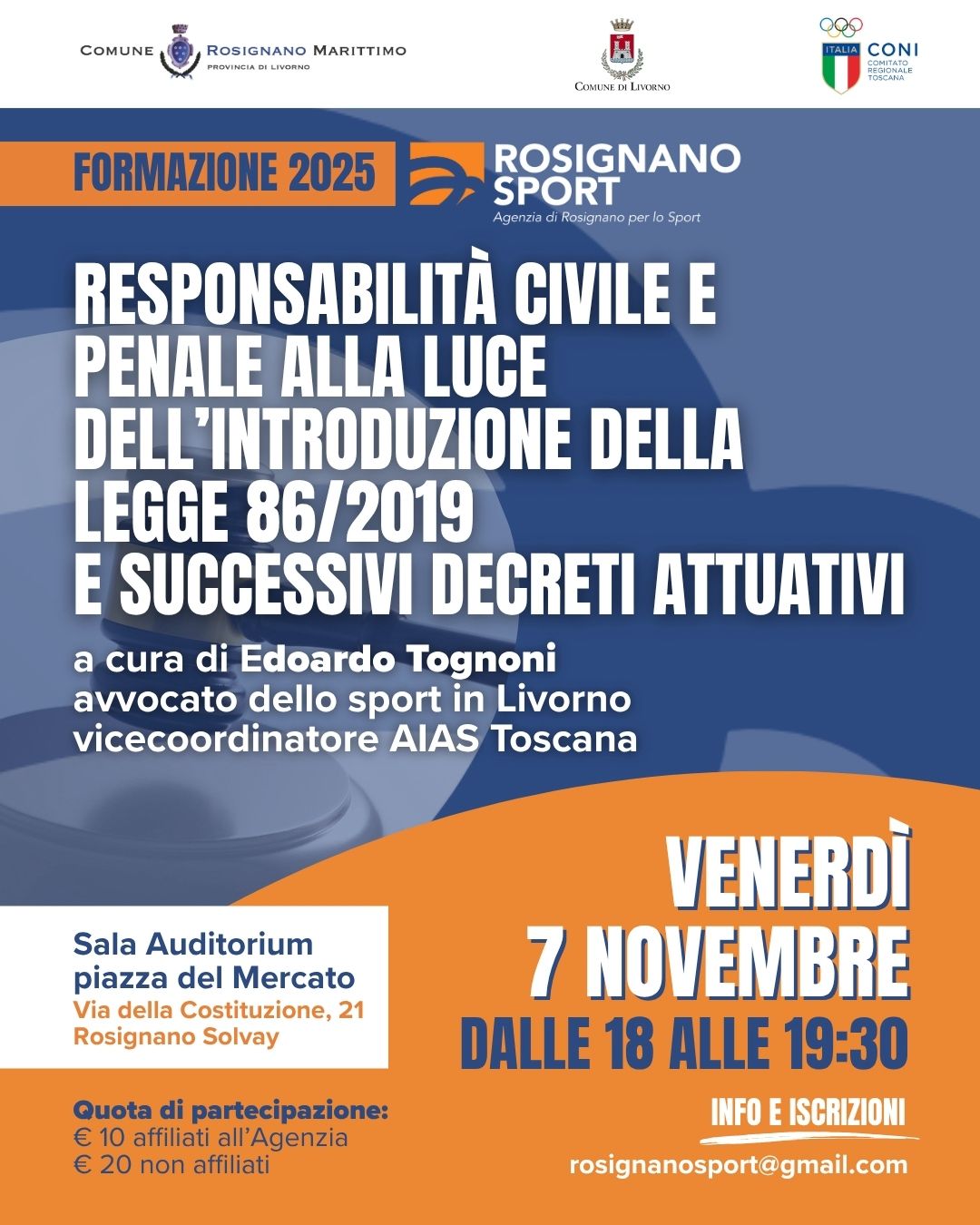 Per info e iscrizioni (entro il 3 novembre): rosignanosport@gmail.com. Per agevolare la partecipazione, è stato predisposto un modulo di iscrizione online dove è possibile inserire, sin da subito, eventuali quesiti da sottoporre ai relatori, così da rendere gli incontri ancora più mirati ed efficaci.