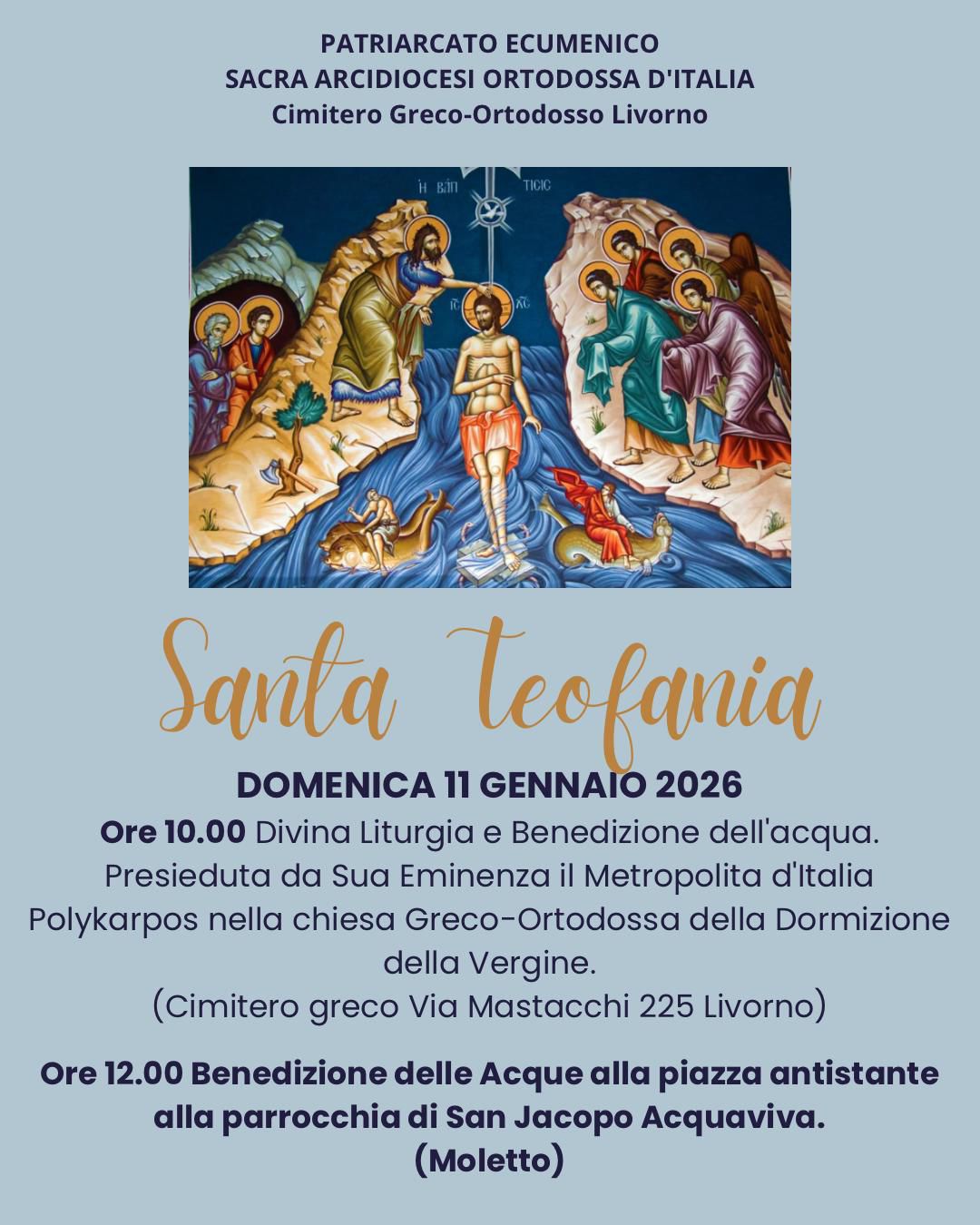 alle ore 10, nella Chiesa della Dormizione della Vergine Madre di Dio, presso il Cimitero greco di via Mastacchi 225, avrà inizio la Divina Liturgia, con Benedizione dell'Acqua in memoria del Battesimo di Gesù nel fiume Giordano. Il rito sarà presieduto da Sua Eminenza il Metropolita d'Italia Polykarpos.