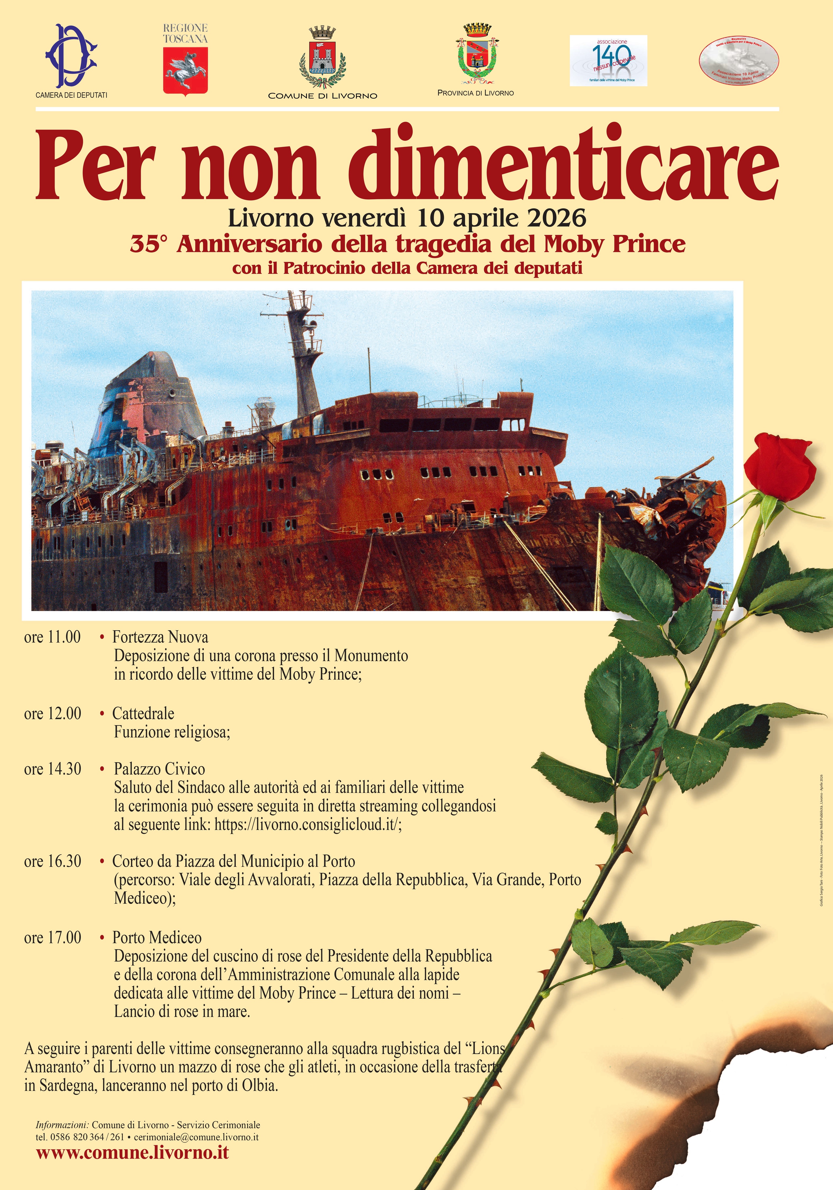 Alle ore 17 all’interno del Porto Mediceo, presso la lapide dedicata alle Vittime del Moby Prince (piazza dell’Arsenale), deposizione di un cuscino di rose inviato dal Presidente della Repubblica e di una corona di alloro a cura dell’Amministrazione comunale. È prevista la lettura dei nomi delle Vittime e il lancio di rose in mare.